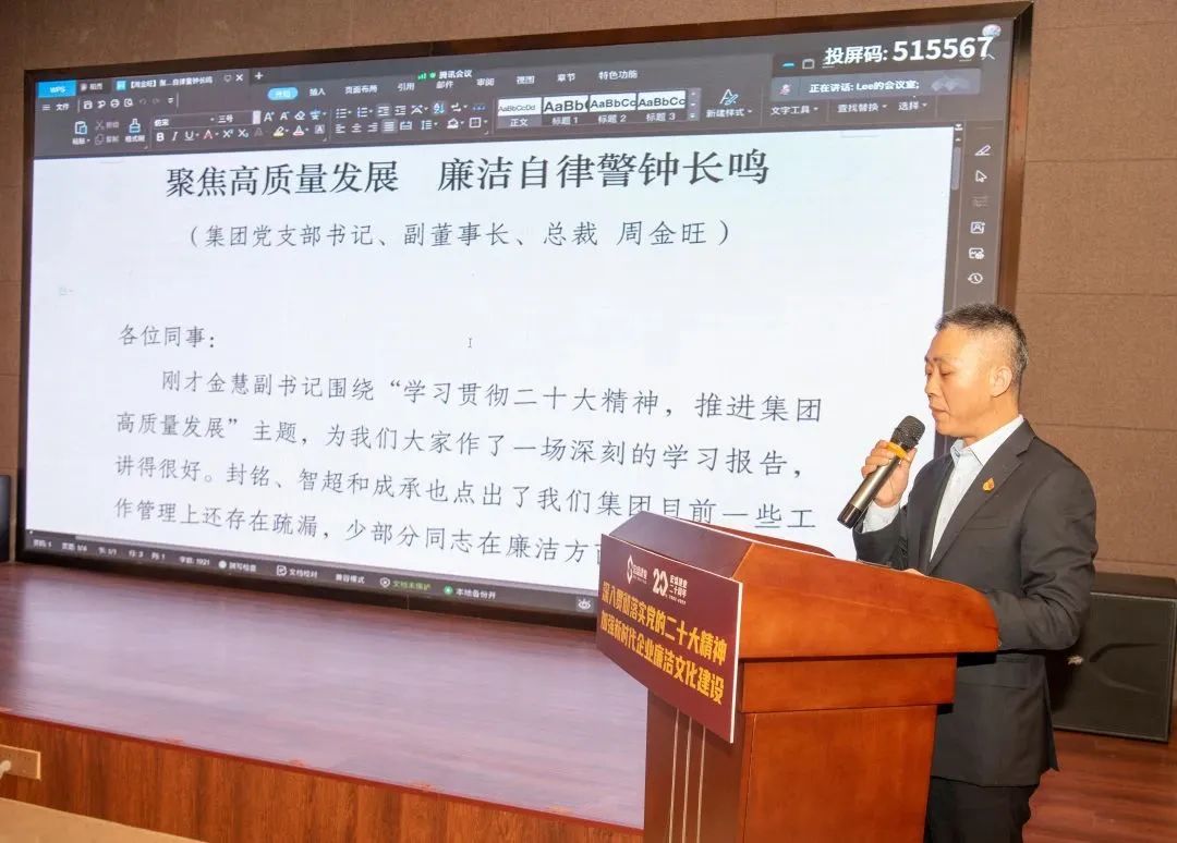 座談會上集團黨支部書記、副董事長、總裁周金旺從加強黨員、管理層表率,廉潔自律作為企業(yè)管理的思想核心,抓好“四嚴”,強化監(jiān)督機制等方面進行了要求與督促,并表示通過弘揚廉潔文化,“激濁揚清、扶正祛邪”,有利于進一步建立健康向上的企業(yè)文化。我們要不斷建立健全廉潔文化建設的體制和機制,以制度和規(guī)范相結合,使廉潔成為一種習慣,成為一種文化自覺,營造清明、清朗、清新的良好企業(yè)生態(tài)。