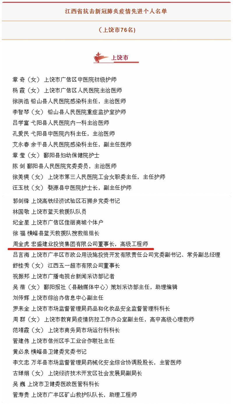 宏盛建業(yè)董事長(zhǎng)周金虎獲評(píng)“江西省抗擊新冠肺炎疫情先進(jìn)個(gè)人”