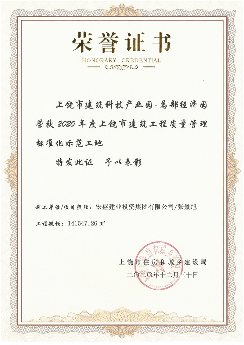 上饒市建筑科技產業(yè)園-總部經濟園項目榮獲“2020年度上饒市建筑工程質量管理標準化示范工地”。