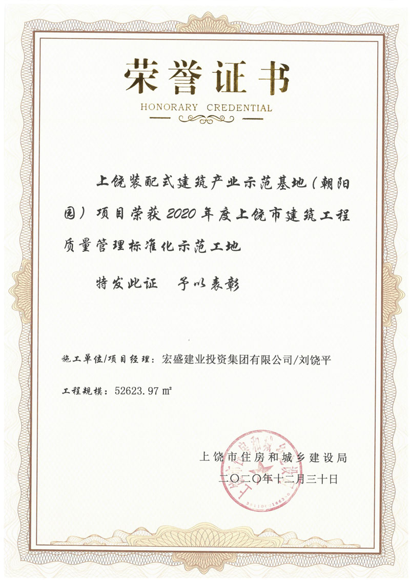 上饒裝配式建筑產業(yè)示范基地(朝陽園)項目榮獲“2020年度上饒市建筑工程質量管理標準化示范工地”。