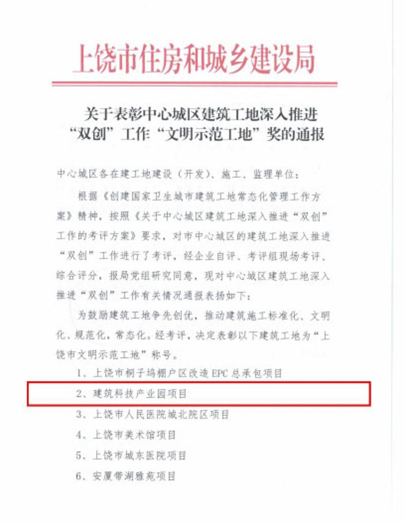 集團投資承建上饒市建筑科技產(chǎn)業(yè)園項目獲評上饒市文明示范工地