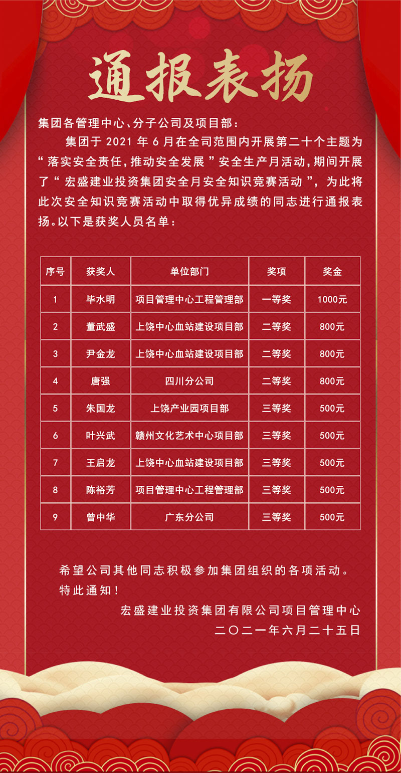集團(tuán)于2021年6月在全司范圍內(nèi)開(kāi)展第二十個(gè)主題為“落實(shí)安全責(zé)任,推動(dòng)安全發(fā)展”安全生產(chǎn)月活動(dòng),期間開(kāi)展了“宏盛建業(yè)投資集團(tuán)安全月安全知識(shí)競(jìng)賽活動(dòng)”,本次活動(dòng)有超過(guò)100位員工參加了在線考試,他們是集團(tuán)所屬所有項(xiàng)目管理人員,所有項(xiàng)目工程管理派駐人員,所有分公司工程部管理人員。員工們?cè)鷮?shí)的安全知識(shí)為他們?nèi)〉昧瞬诲e(cuò)的成績(jī),對(duì)這些優(yōu)秀的員工公司也對(duì)他們進(jìn)行了獎(jiǎng)勵(lì)。