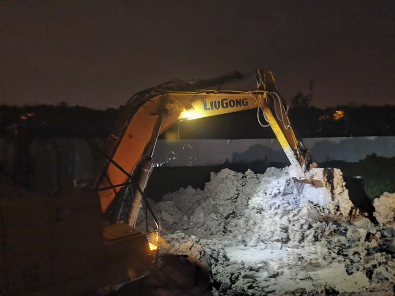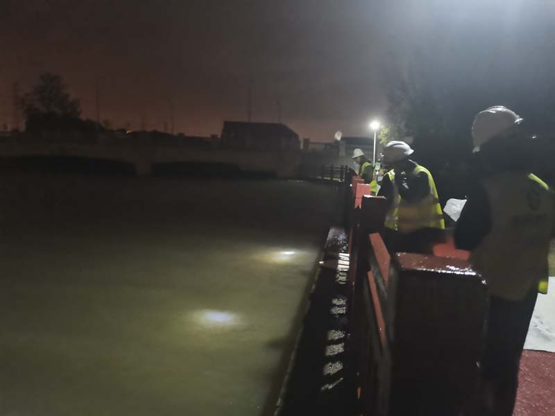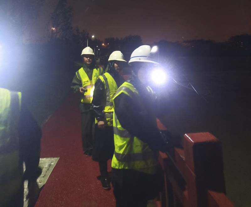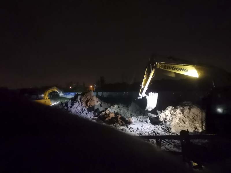 由于臨河水位的不斷上升,避免漲水淹沒我司做的地下工程,立馬調(diào)來三臺挖掘機和兩臺渣土車連夜工作,現(xiàn)場挖土加高項目南側(cè)的路面?,F(xiàn)場狂風暴雨,搶險支援隊的同事始終站在大雨中一絲不茍地指揮著。