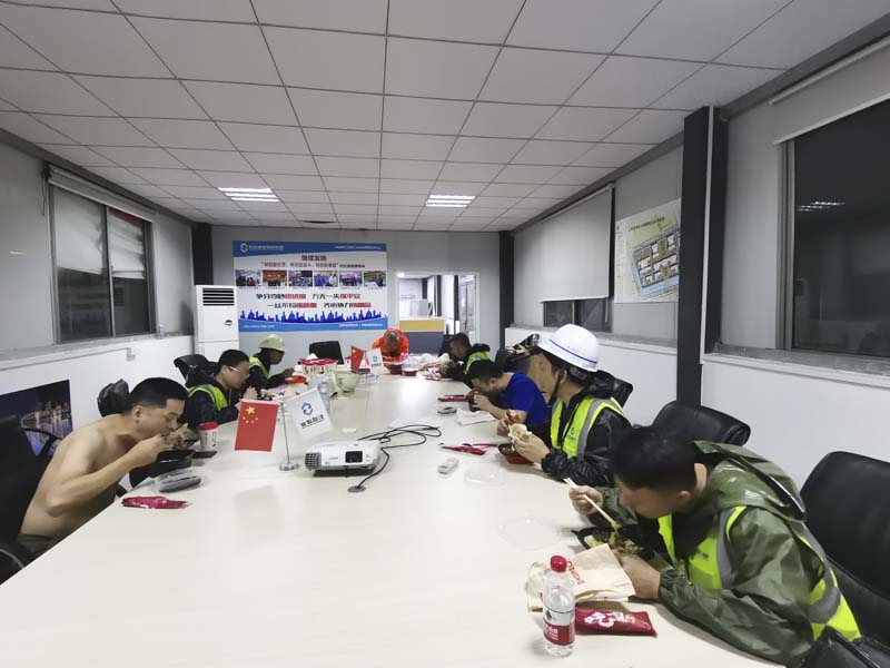 汗水雨水夾雜在一起,部分員工的衣服已經(jīng)全濕。一到現(xiàn)場就先開始了展開工作,直至深夜大家才吃上晚餐。據(jù)了解,宏盛醫(yī)都項目搶險支援隊從25日下午開始,一直忙到27日凌晨三點,大家始終堅守在抗擊臺風的第一線,連續(xù)奮戰(zhàn)2天2夜,安全優(yōu)質(zhì)地完成了抗擊臺風的任務,充分彰顯出宏盛人“特別能吃苦、特別能戰(zhàn)斗、特別能奉獻”的精神特質(zhì)。